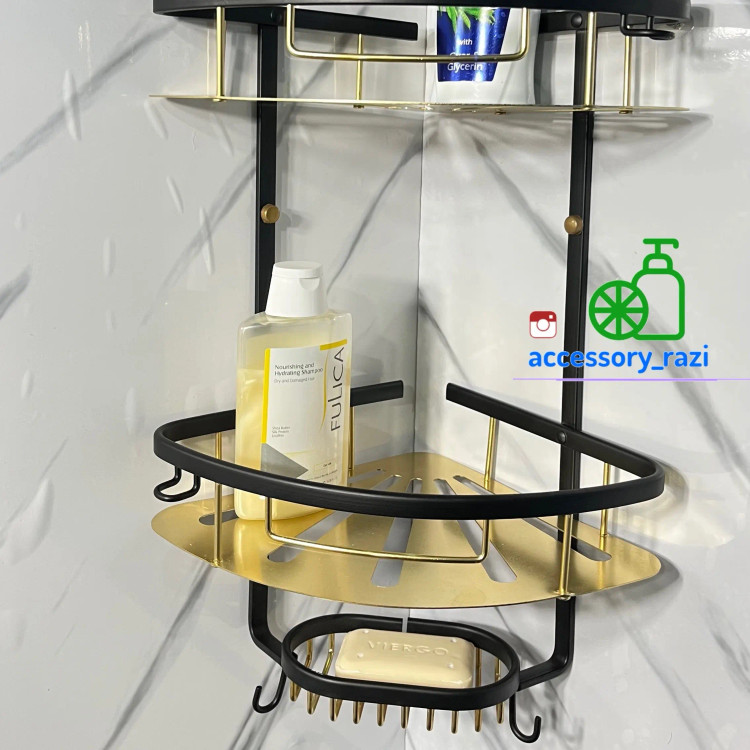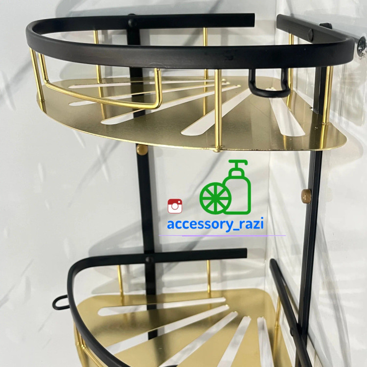 قفسه حمام مشکی طلایی 2 طبقه آلومینیمی مدل کنج صفحه ای تی بی کو TBCO شلف استند سرویس بهداشتی دو جا شامپو و صابون
