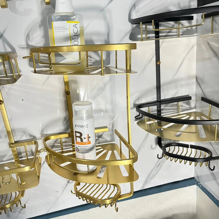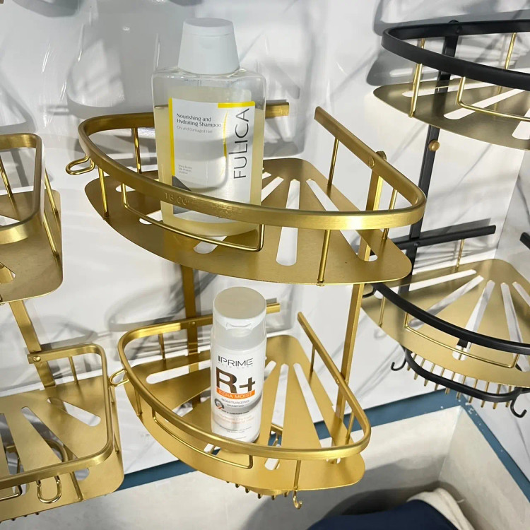 قفسه حمام طلایی 2 طبقه آلومینیمی مدل کنج صفحه ای تی بی کو TBCO شلف استند سرویس بهداشتی دو جا شامپو و صابون