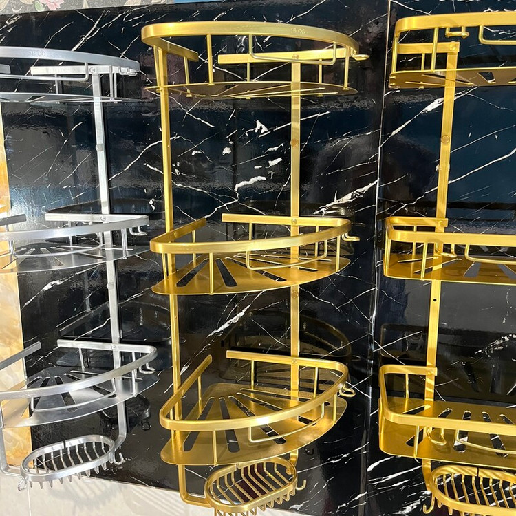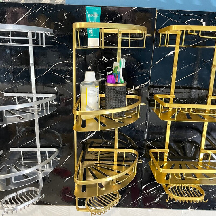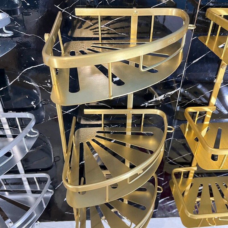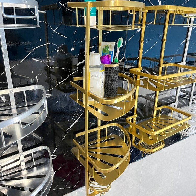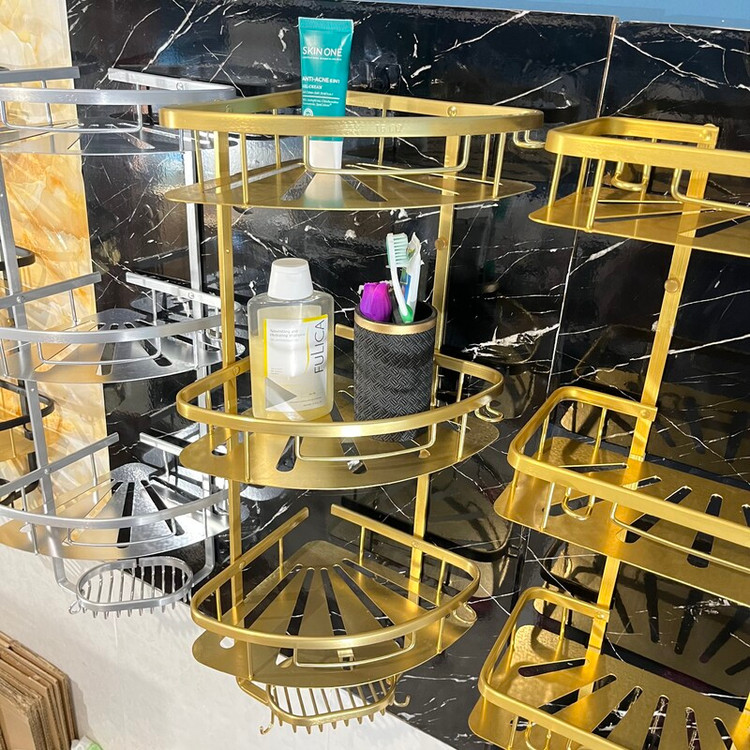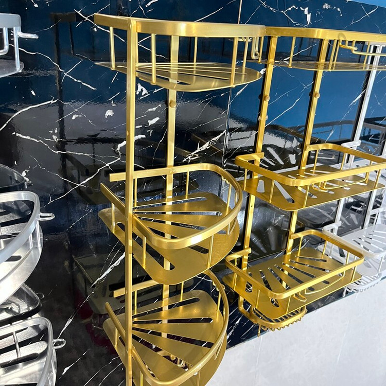 قفسه حمام طلایی3 طبقه آلومینیمی مدل کنج صفحه ای تی بی کو TBCO شلف استند طبقه سرویس بهداشتی سه جا شامپو و صابون